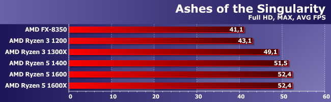 Это приложение, напротив, для сравнения процессоров подходит неплохо: частота кадров все еще относительно невысокая, но разница между испытуемыми есть, и заметная. Правда, на уровне Ryzen 5 она «заканчивается»: Ryzen 5 1400 хватает на 51 FPS, а существенно больше получить не дает уже видеокарта. Примерно столько же может обеспечить и Ryzen 3 на частотах выше 3,5 ГГц — то есть Ryzen 3 1300Х «из коробки» или немного разогнанный Ryzen 3 1200 (для разгона, напомним, подходят и недорогие системные платы на чипсете В350).