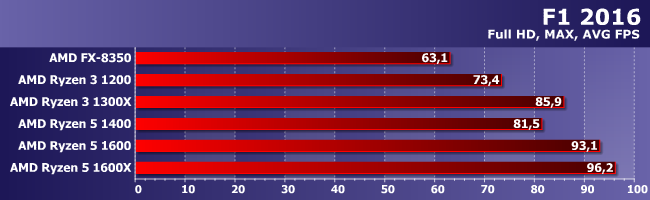 Вся линейка F1 (как и Far Cry) всегда «любила» многопоточность. К сожалению, несложно заметить, что многопоточность годится не всякая: чуть более высокая частота позволяет Ryzen 3 1300X демонстрировать более высокую производительность, нежели Ryzen 5 1400. А «точка насыщения» у используемой видеокарты находится где-то в районе шести процессорных ядер — можно даже низкочастотных. Впрочем, спокойно играть в F1 2016 можно и на Ryzen 3 1200 даже без разгона. Более медленные видеокарты (коих тьмы и тьмы даже среди современных моделей) тем более производительность ограничат в куда большей степени.