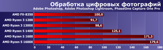 Как уже было замечено на примере процессоров Intel, Adobe Photoshop CС 2015.5 просто жить не может без SMT. Продукты AMD теперь находятся в том же положении, только к ним это приложение относится несколько более щадящим образом, снижая производительность не в три, а «всего» в два раза. Разумеется, страдают из-за этого в первую очередь как раз Ryzen 3. Впрочем, для конкуренции с процессорами под АМ3+ (не говоря уже о разнообразных FMx), в общем-то, хватает и их. Тем более, что в пакетном режиме RAW-конвертеров они быстрее FX, несмотря на меньшее количество поддерживаемых потоков вычислений, хотя тут это имеет весомое значение.