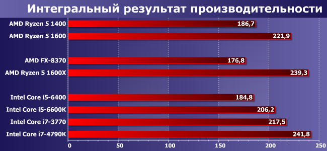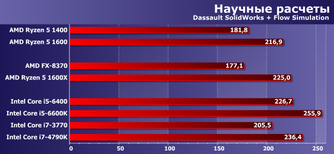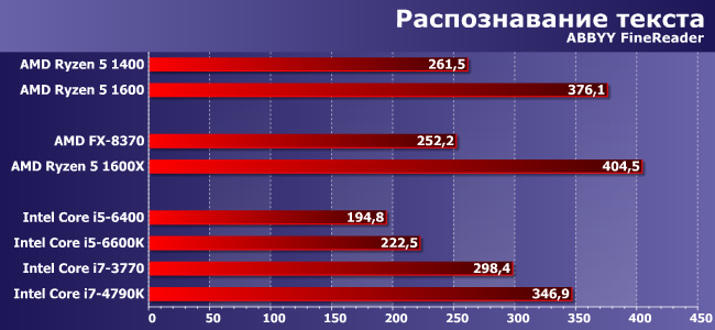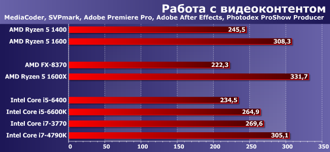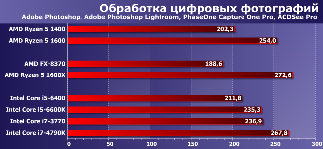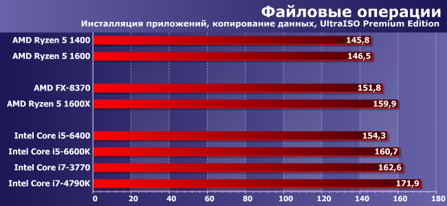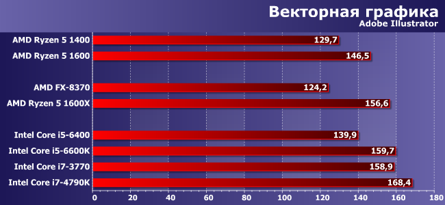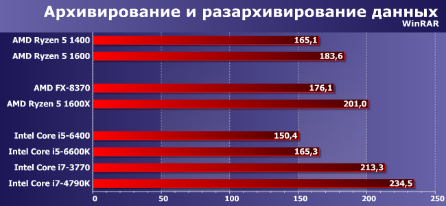 В этой группе приложений дополнительные потоки нередко «лишние», так что, как видим, Ryzen 5 1600 хватает на то, чтобы справиться с любыми Core i5 (возможно, за исключением 7600К), но лишь пяти-, а не трехлетними Core i7. Ryzen 5 1400 же оказался медленнее, чем даже Core i5-6400. Впрочем, нет в этом ничего неожиданного: 1600/1600Х имеют фору перед Core i7 по числу физических ядер, а вот четырехъядерные Ryzen обходят Core i5 лишь по «виртуальным». В целом это тоже неплохо — но в меньшей степени. Собственно, и Core i7 лучше Core i5 того же поколения не всегда слишком уж заметно по той же причине. Но FX-8370, кстати, опять позади — вполне возможно, что это вовсе не совпадение.