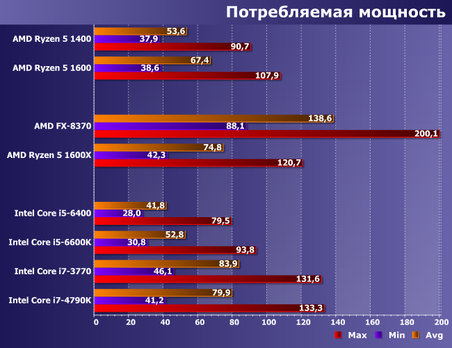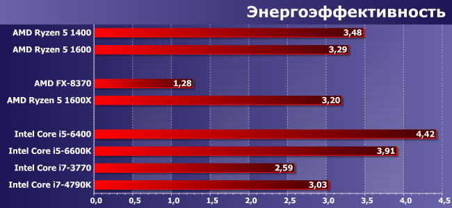 Если рассматривать не только скорость решения задач, но и затрачиваемую на это энергию, то Ryzen 5 1400 и Ryzen 5 1600 начинают выглядеть еще привлекательнее. Ryzen 5 1600 имеет уровень энергопотребления ниже старых Core i7 при сравнимой (а зачастую — и более высокой) производительности. В абсолютных же цифрах Ryzen 5 1400 еще интереснее: он хоть и проигрывает немного Core i5, но зато вся связка из процессора, памяти, платы и видеокарты (той части ее потребления, которая обеспечивается через слот PCIe) даже в худшем случае требует менее 100 Вт. В среднем же — немногим более 50. Для сравнения — старые платформы AMD на такое были в принципе неспособны. Даже если не рассматривать АМ3+ со всеми ее особенностями, Athlon X4 уже куда более «прожорливы» в аналогичных условиях! В общем, можно вполне рассчитывать на то, что APU на базе новой архитектуры позволят компании вернуться и на те рынки, которые были утрачены — типа ноутбуков.