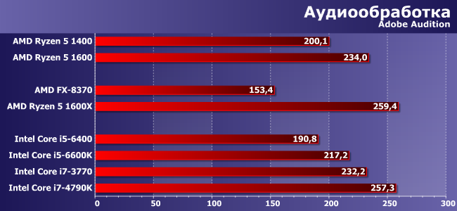 Сторонники теории заговоров наверняка отметят, что Audition список тестовых программ покидает из-за того радикального улучшения показателей процессоров AMD :) Причины несколько иные, но, в любом случае, неплохо, что разные модели Ryzen мы и с ее участием успели протестировать. Мир современного программного обеспечения настолько многообразен, что по одному приложению нельзя делать выводы по всем остальным. Существуют в нем и такие программы, где даже младших Ryzen 5 уже достаточно для прямой конкуренции с более дорогими процессорами Intel, ну а не самые младшие (но все равно недорогие) вообще могут и лидирующие позиции занять.