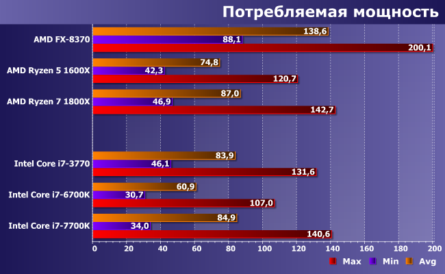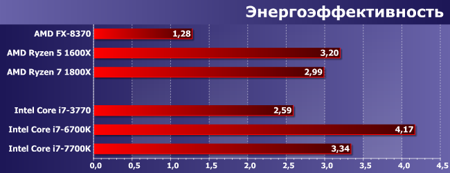 В принципе, это то, о чем до начала измерений энергопотребления говорилось неоднократно: разные экземпляры процессоров могут вести себя по-разному, да еще и по-разному реагировать на окружающие условия. С другой стороны, все может быть и не так страшно, если вспомнить предыдущий «Refresh»: на одной и той же плате i7-4770K оказывался существенно экономичнее, чем i7-4790K, причем последний не был совсем уж «ужасен» — просто это был возврат к уровню i7-3770, но при более высокой производительности, чем и у последнего, и у i7-4770K. Теперь то же самое «нарисовалось» в очередной раз, причем усугубилось за счет использования более быстрой памяти и, соответственно, большей нагрузки на ИКП и кэш. Т. е. повышение производительности «массовых» Core i5/i7 в принципе возможно, но сдерживает его не «злая воля» Intel, а простое нежелание увеличивать энергопотребление, которое при экстенсивных методах (привет оверклокерам!) растет намного быстрее, чем производительность. Хотя запас, конечно, есть — недаром же система крепления кулеров массовой платформы Intel сохраняется идентичной с самого 2009 года: стало быть, верхней границей являются Core первого поколения для LGA1156, в конкурсе на должность «обогревателей» способные поспорить даже с решениями для АМ3+. Но иногда приходится в какой-то степени возвращаться к истокам — как при обновлении LGA1151, когда в Intel решили производительность и «разгоняемость» новых решений немного улучшить. А поскольку на рынке настольных процессоров пока все же не один производитель, а хотя бы двое, «рассогласованность» их действий может выглядеть и вот так. Если Ryzen 7 1800X потребляет немного больше энергии, чем Core i7-7700K, то Ryzen 5 1600X — экономичнее последнего.