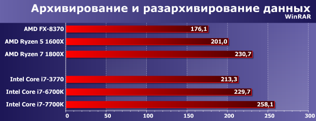 Как уже не раз было сказано, процессоры Skylake с архивированием на фоне предшественников справляются не слишком-то убедительно. У нынешних Ryzen тоже не идеально, однако на практике достаточно быстро. Если же убрать распаковку (которая до сих пор выполняется в один поток) — в относительном исчислении будет еще лучше.