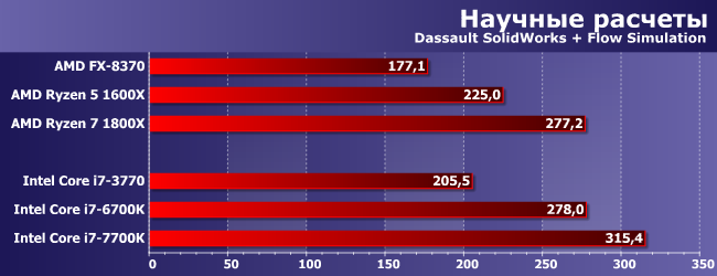 Как мы помним, среди процессоров для LGA2011-3 максимальную производительность в этой программе демонстрируют шестиядерные модели, причем и они-то медленнее того же Core i7-3770. Среди Ryzen тоже самым быстрым оказался шестиядерный 1600Х, только оба протестированных на данный момент процессора этой архитектуры быстрее того же Core i7-3770. Впрочем, мы не удивимся, если Ryzen 5 1500X окажется еще быстрее — это просто очередной факт в копилку важности не просто «многопоточной оптимизации», но «правильной многопоточной оптимизации». И влиянии качественных, а не только количественных характеристик на итоговую производительность, конечно.