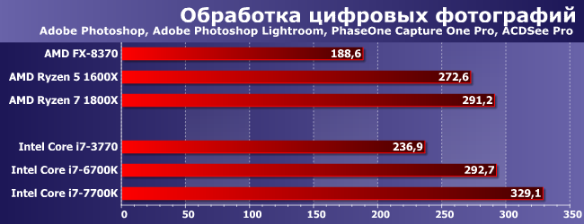При обработке фотографий разница между 1600Х и 1800Х еще меньше, что ожидаемо: программы этой группы в меньшей степени восприимчивы к количеству вычислительных ядер. С учетом цен, еще один аргумент именно в пользу Ryzen 5. Несмотря на то, что это семейство в данном случае проигрывает Core i7 — ему можно, благо и стоит дешевле. Старые Core i7, во всяком случае, обходит достаточно убедительно.