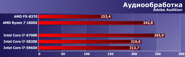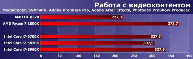 Выше недаром было сказано про «большой скачок», хотя в рамках продукции AMD он вообще огромный: превосходство над FX практически на 70%. И не надо говорить о разнице в цене — просто FX и приходилось неоднократно уценять именно из-за проблем с производительностью. У Ryzen же никаких проблем нет — это быстрые процессоры. Из сегодняшних участников 1800Х самый быстрый, да и даже от Core i7-6950X он отстал на микроскопическую величину, а в данном случае разница в цене в его пользу (мягко говоря). Понятно, что чем ядер больше, тем больше и проблем с их утилизацией, почему и «обычный порошок» в виде i7-6700K выглядит здесь не так уж плохо, но эта проблема бьет и по LGA2011-3. Старшие же представители для АМ4 ведут себя не хуже. На самом деле, даже лучше. Так что тем, кто много работает с видео, однозначно стоит присмотреться к Ryzen 7: на текущий момент это семейство процессоров практически вне конкуренции.