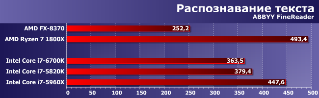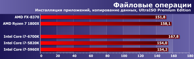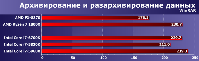 С архивацией данных и обратным процессом (где, кстати, FX тоже смотрелся очень хорошо), Ryzen 7 1800X справляется пусть и не лучше всех, но на отлично. Могло бы быть и быстрее, но это уже детали: в конце-концов, всем многоядерным процессорам здесь мешает однопоточность распаковки архивов. Операция, безусловно, частая, но все равно уже настолько быстрая, что в следующем году мы затрачиваемое на нее время уже учитывать не будем. Что, разумеется, в наибольшей степени «поможет» процессорам с 8-10 ядрами.
