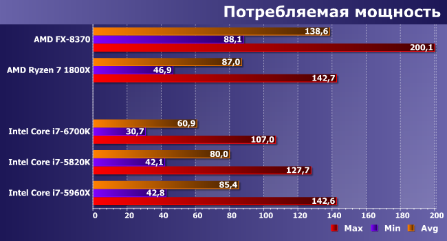 Впрочем, даже без поправки на все вышеперечисленное, критиковать Ryzen 7 1800X нам не за что — в отличие от. Да — энергопотребление платформы (напомним, что учитывается при измерениях не только процессор, но и плата с памятью, а также то, что дискретная видеокарта получает через слот PCIe, а не по собственным выделенным линиям питания) несколько выше, чем свойственно современным настольным моделям процессоров Intel для LGA1151, но вполне сопоставимо с LGA1150, не говоря уже о LGA1155. А вообще Ryzen 7 наиболее правильно сравнивать с процессорами для LGA2011-3 (причины чего выше озвучены неоднократно) — и здесь вообще паритет. Во всяком случае, если рассматривать Haswell-E — Broadwell-E немного экономичнее, но речь идет о считанных Ваттах.