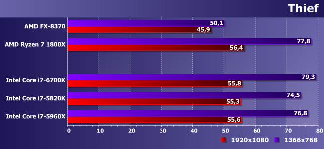 Но наиболее «мощный» пример — пожалуй, Thief. Заметим, игра сама по себе «тяжелая», явно заинтересованная в большом количестве ядер (в испытаниях на GTX 1070 она оказалась одной из немногих, где самый младший Core i5-6400 работал все же немного быстрее, чем старший Core i3-6320) — в общем, слабакам здесь не место. Что получилось в итоге — в подробных комментариях, как нам кажется, просто не нуждается.