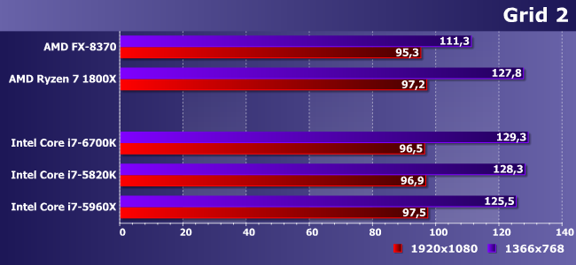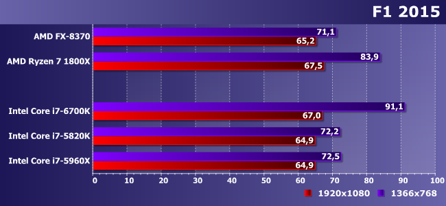 Движки семейства EGO чуть ли не с момента своего появления поддерживают многопоточность, однако FX ранее это не слишком помогало. Точнее, в FHD-режиме «достать» до потенциальных возможностей R9 380 (хотя бы) он мог, но стоило снизить нагрузку на видеокарту, так сразу становилось понятно — чьи в лесу шишки. С выходом Ryzen 7 вопрос перестал быть столь однозначным. Причем особенно интересно положение дел в F1 2015, с которой плоховато справлялись процессоры для LGA2011-3. Ryzen 7 1800X это касается в намного меньшей степени.