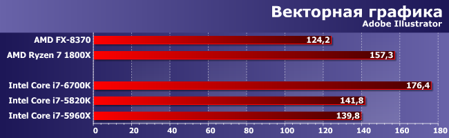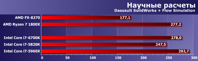 Поскольку данное приложение тоже не может похвастаться качественной многопоточной оптимизацией — какая-то есть, но не достаточная для однозначной победы многоядерных процессоров. Даже наоборот — у решений Intel явно прослеживается точка перегиба где-то в районе шести ядер, после чего производительность вовсе падает. В Ryzen нормально работают восемь, так что хоть процессор и не стал лидером в общем зачете, но зато он обогнал любые модели для LGA2011-3. Да и не только их — забегая вперед (поскольку это уже тема «итогов») быстрее его тут разве что три-четыре модели Intel, типа 4790К и аналогичных высокочастотных. И превосходство над FX до 60% соответственно.