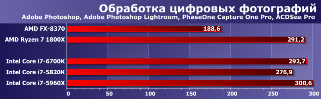 Да и фото это тоже касается — 1800Х здесь лидером не стал хотя бы из-за меньшей тяги программ данной группы к многопоточности (впрочем, в Lightroom и Capture One, где она востребована, процессор немного отстает от 5960Х, но ему можно — он куда дешевле; в Photoshop зато быстрее), но продемонстрировал более чем достойный результат. Во всяком случае, это не FX, отстающий уже и от современных Core i3 — уровень Ryzen 7 это Core i7 без натяжек. Причем большинство не самых старых процессоров этого семейства (например, любые модели для LGA1150 или LGA2011) уже позади (а ведь первая еще даже в продаже встречается). В общем, краснеть за свою новинку AMD не приходится. Синеть тоже :)