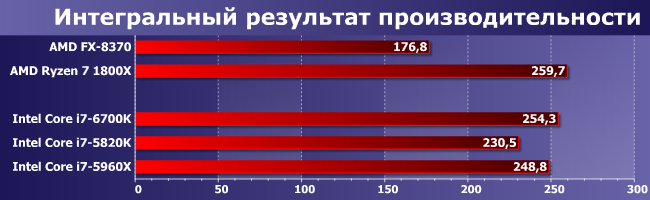 В общем и целом, по совокупности тестов Ryzen 7 1800X финишировал первым! Нельзя сказать, что он так уж радикально опередил прочих участников, но ведь смог сделать то, чего не было лет уже 10. Несмотря на то, что, как уже не раз было написано, массовое ПО до сих пор не может похвастаться какой-то повышенной тягой к многоядерным процессорам, зачастую спокойно довольствуясь парой ядер — даже без четырех можно обойтись, а тут восемь. Но, как видим, это сильно «бьет» по дорогим (очень дорогим на текущий момент) восьми-десятиядерным процессорам Intel — и куда слабее по Ryzen. Который, все же, тоже не рассчитан именно на массовый рынок — в текущем исполнении, во всяком случае. Но и не требуется — там наверняка хорошо будут смотреться Ryzen 5, а еще лучше APU на новой микроархитектуре. Ryzen 7 же — процессоры для тех, кто знает как задействовать много ядер. И в таком случае он может оказаться вовсе самым быстрым даже при сравнении с более дорогими процессорами. Но неплохо выступает и в прочих случаях — в отличие от FX, которые кое-как могли продаваться лишь по низким ценам и благодаря этим самым ценам. И не только из-за производительности, которая не шла ни в какое сравнение даже со старыми Core i7 на базе Ivy Bridge, но и по другим немаловажным параметрам.