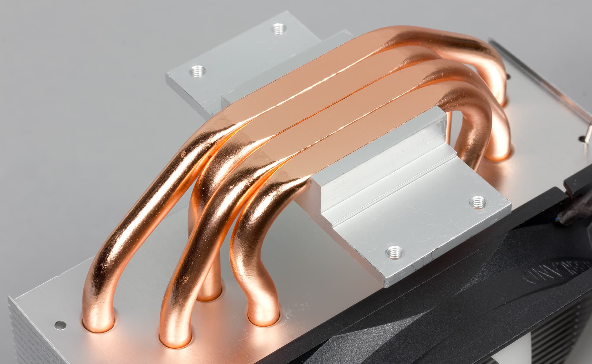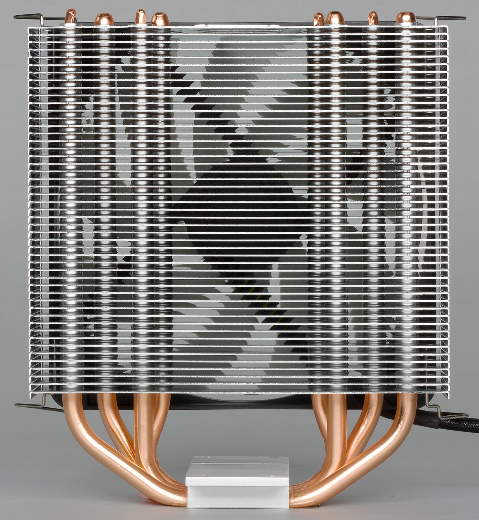 Кулер оснащен вынесенным радиатором, к которому тепло от подошвы передается по четырем тепловым трубкам. Трубки, разумеется, медные. У подошвы теплосъемника трубки сплющены и впрессованы в толстую алюминиевую пластину, снаружи анодированную. Прилегающие к процессору плоскости трубок сошлифованы, но не отполированы. На подошве теплосъемника между трубками есть выраженные канавки. До установки подошва защищена пластиковой пленкой.