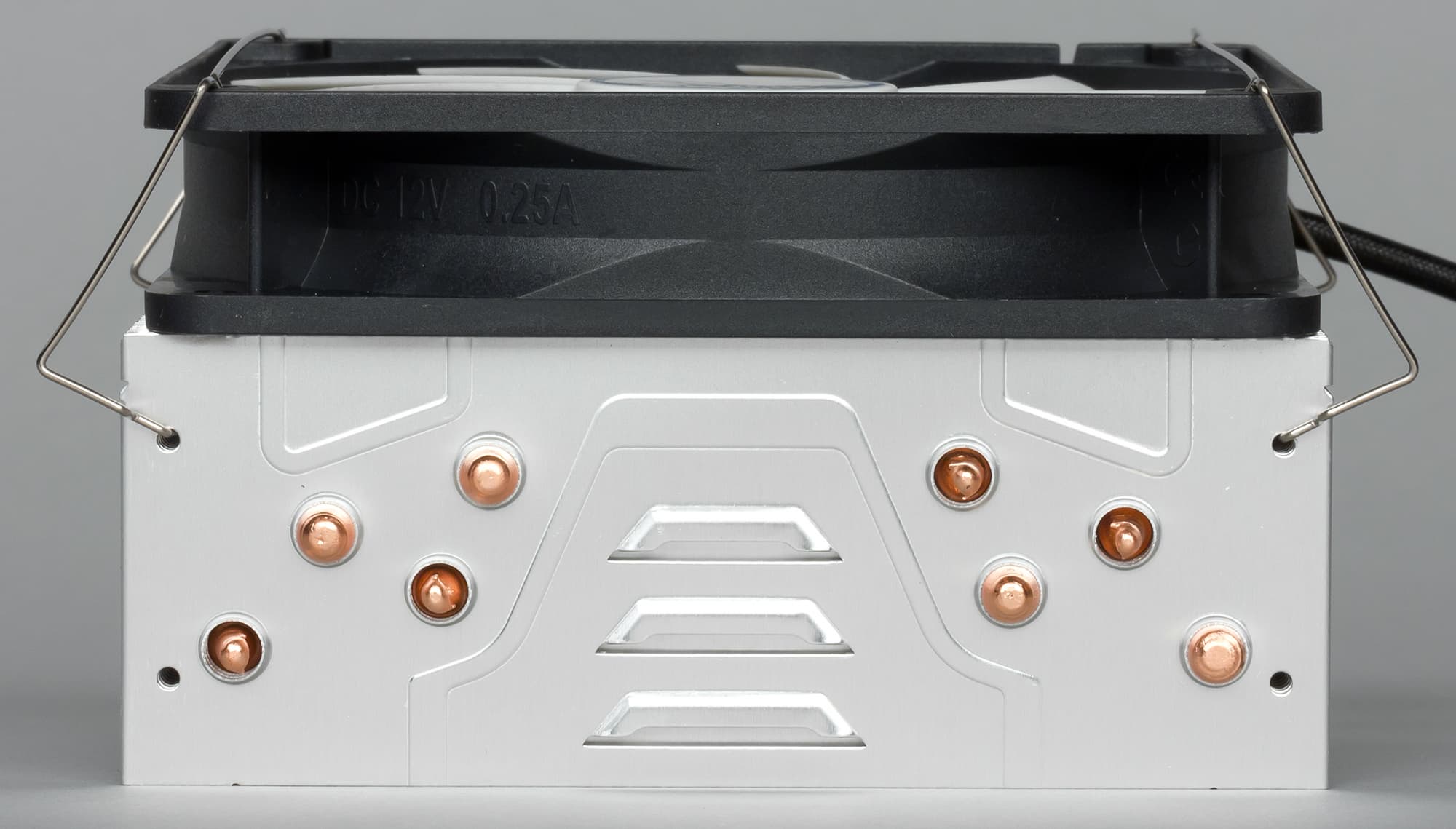 Вентилятор крепится к радиатору скобочками из тоненькой проволочки из нержавеющей стали (в комплекте скобочек на два вентилятора), при этом в принципе допускается установка вентилятора с любой стороны радиатора на вдув или выдув (или двух вентиляторов на радиатор). В инструкции рекомендуется ставить вентилятор на вдув и учитывать то, как установлен корпусной вентилятор, чтобы он и вентилятор на кулере гнали воздух в одном направлении.