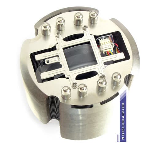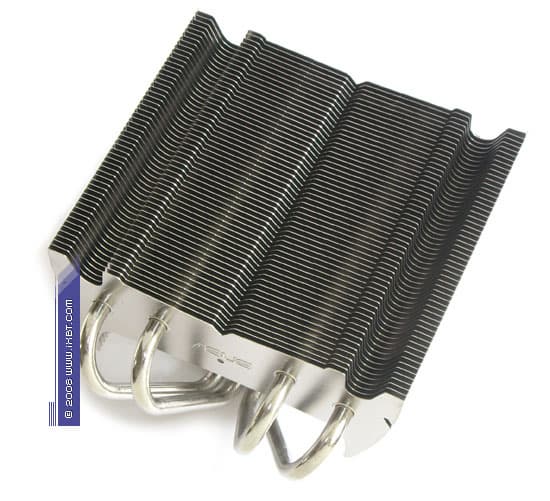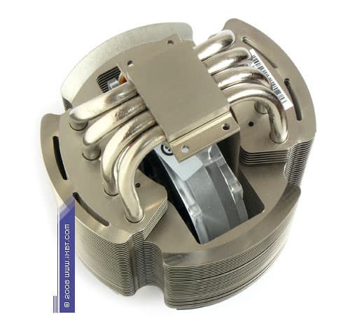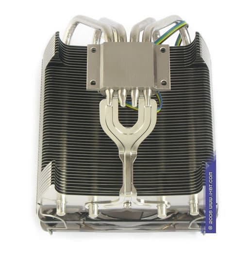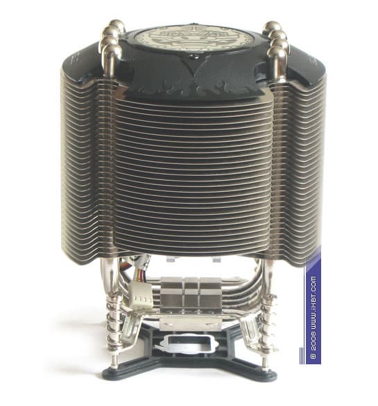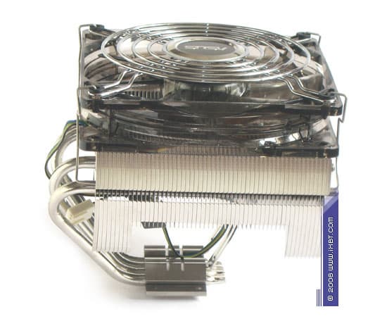 Неплохо собран Triton 85 и в чисто термической детализации — развернутое в горизонтальной плоскости оребрение демонстрирует вполне серьезную параметрику (55 пластин, толщина 0,2 мм, шаг размещения 2 мм) вкупе с развитой поверхностью теплообмена (общая площадь порядка 3500 см2). Здесь следует отметить еще и сдвиг рабочих участков тепловых трубок на периферию радиатора — то есть, в область наиболее выраженных воздушных потоков, что осуществляется с очевидной целью интенсифицировать теплосброс по линии трубки-оребрение, и соответственно, оптимизировать полное термическое сопротивление кулера. Другим интересным «улучшайзером» в теле нашего подопытного становится вспомогательный упор, или лучше сказать — «рогатка», которая блокирует перегибы трубок и защищает радиатор от механических повреждений при неосторожном обращении.