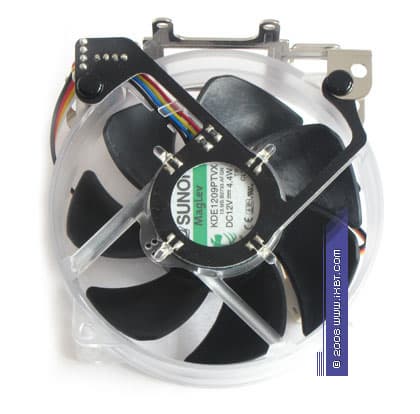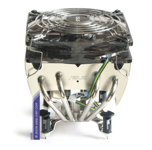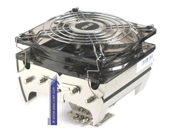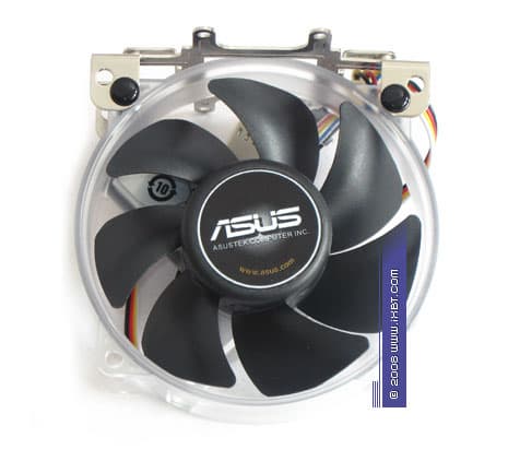 Опять же, в эксплуатационную копилку нашего подопытного следует зачислить ШИМ-контроль оборотов набортного вентилятора — учитывая повсеместное распространение четырехконтактных управляемых разъемов, на сегодня это не каприз или особая «фича», а самая настоящая норма жизни. Как водится, диапазон регулировки оборотов тут весьма широк (скорость вращения крыльчатки варьируется от 500 до 2300 об/мин) — соответственно, в условиях малой или средней тепловой нагрузки на процессор набортный вентилятор способен гарантировать почти что бесшумную работу кулера с сохранением приемлемого теплового режима. А тем категориям граждан, кто уделяет пристальное внимание не только сугубо техническим, но и моддинговым составляющим систем охлаждения, наверняка придется по вкусу местная светодиодная подсветка — четыре ярко-голубых светодиода, заботливо припасенные веселыми ребятами из ASUS.
