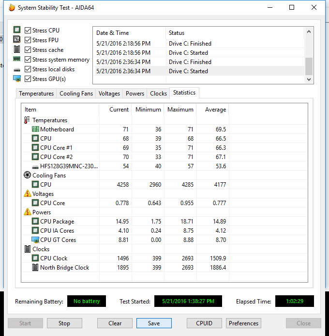 Максимальная нагрузка стресс-теста на все блоки вызывает еще больший рост температур — до 71 и 55 градусов для процессора и накопителя. Вентилятор разгоняется до 4200 об/мин, но даже на этой скорости услышать его можно только при полном отсутствии других источников звука или приложив ухо к корпусу компьютера.