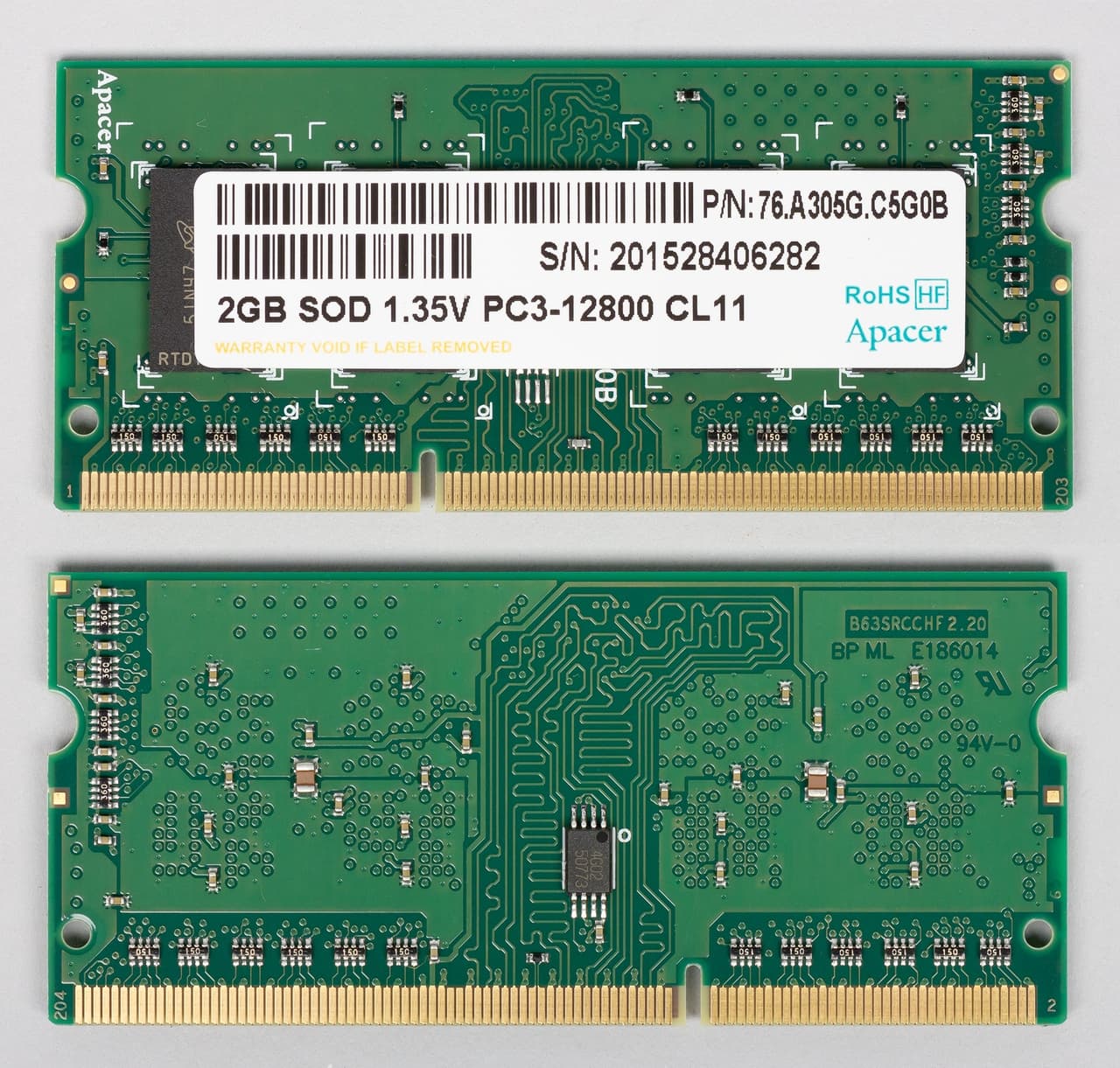 В тестируемом устройстве было два модуля по 2 ГБ (общий объем — 4 ГБ) производства компании Apacer, работающих на частоте 800 МГц (DDR3L-1600 с напряжением питания 1,35 В).