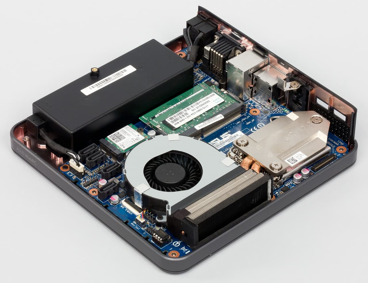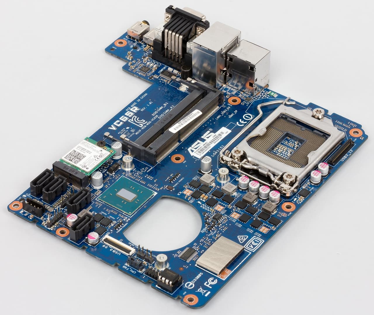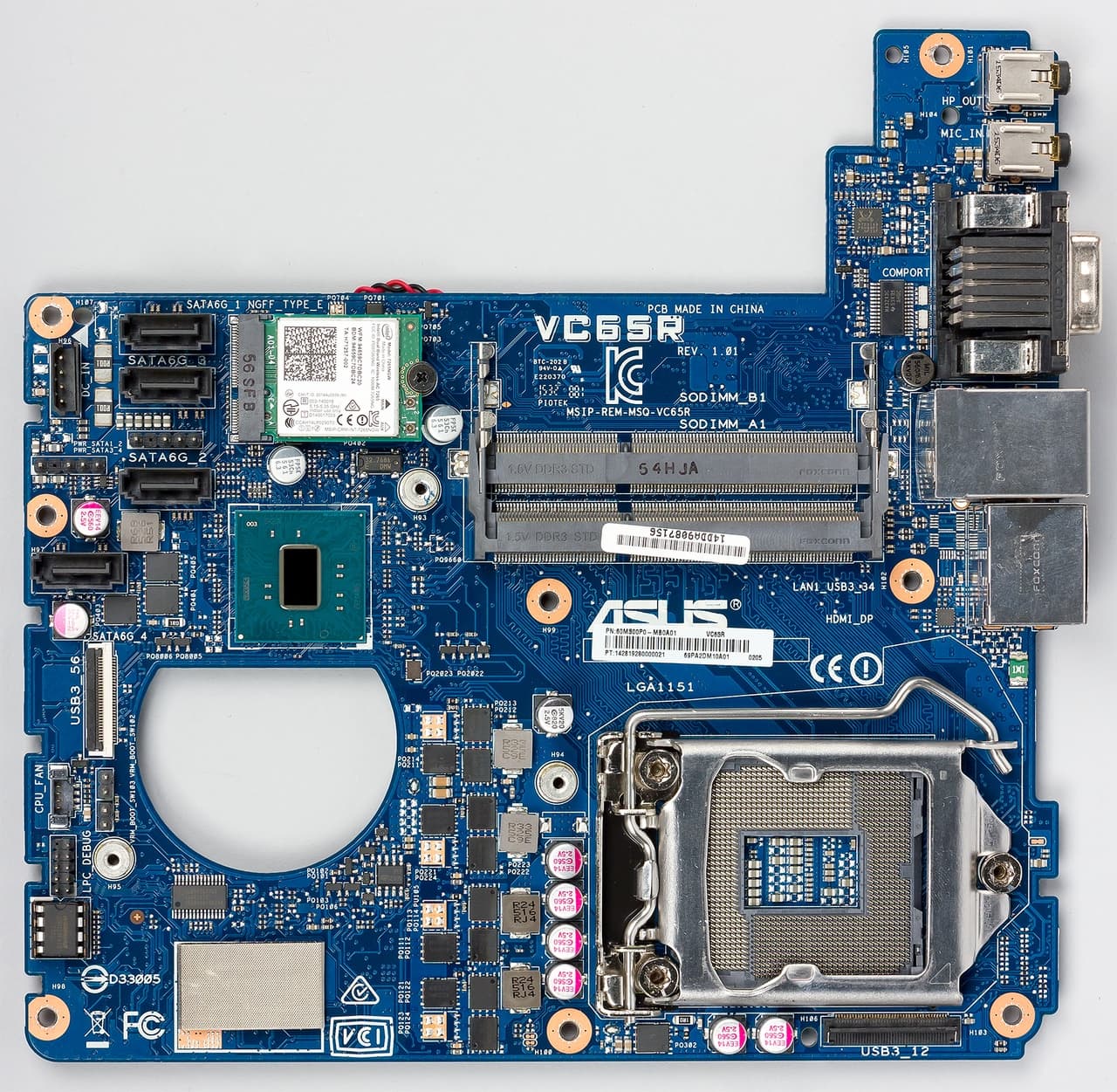 Впрочем, это можно будет проверить в тестировании. На основной печатной плате можно заметить процессор на стандартном сокете под радиатором с тепловыми трубками, центробежный вентилятор системы охлаждения с трехпроводным подключением, два слота SO-DIMM DDR3, четыре разъема SATA (в зависимости от модификации компьютера используются от двух до четырех портов), беспроводной модуль Intel Dual Band Wireless-AC 7265 в слоте M.2. Также в устройстве используются еще две вспомогательные печатные платы для портов USB 3.0, слота карт памяти, кнопок и индикаторов.