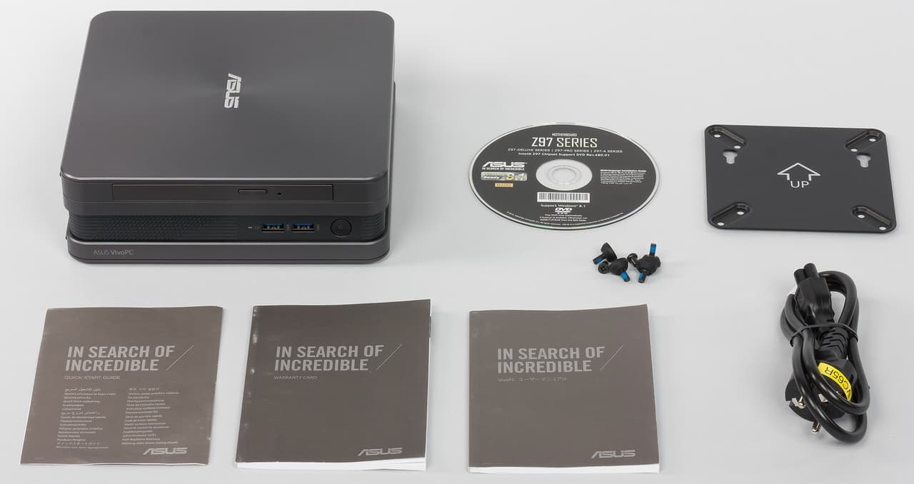 В представленном на тестировании устройстве в комплекте идет кабель питания, крепление на монитор и немного бумажных документов. Отметим, что кабель, на наш взгляд, слишком короткий для удобного использования — всего 80 см, а также имеет относительно редкий «ноутбучный» разъем. Что касается крепления, то оно рассчитано на установку четырьмя винтами на штатные форматы VESA 75 или VESA 100, а сам компьютер вешается на него с использованием двух винтов специальной формы. Правда, с такими размерами и весом этот ПК подойдет не для каждого монитора, учитывая современные тенденции «легкого» дизайна для LED-моделей.