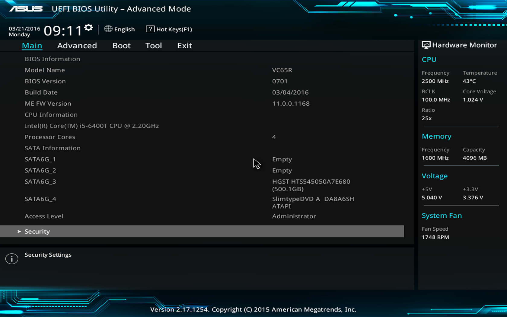 На главной странице мы видим информацию о системе, включая модель процессора, объем и скорость оперативной памяти и подключенные накопители. Здесь же можно настроить время и проверить статус аппаратного мониторинга.