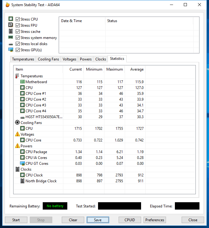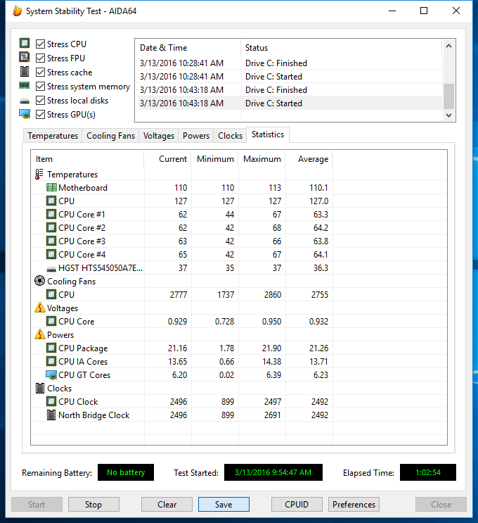 Стресс-тест на все компоненты сразу мы запускали на час. За это время процессорные ядра, работая на частоте 2,5 ГГц, разогрелись примерно до 70 градусов, а температура жесткого диска не превысила 40 градусов. Скорость вращения вентилятора системы охлаждения увеличилась и составляла 2800 об/мин. Уровень шума заметно повысился, но дискомфорта он не вызывал.