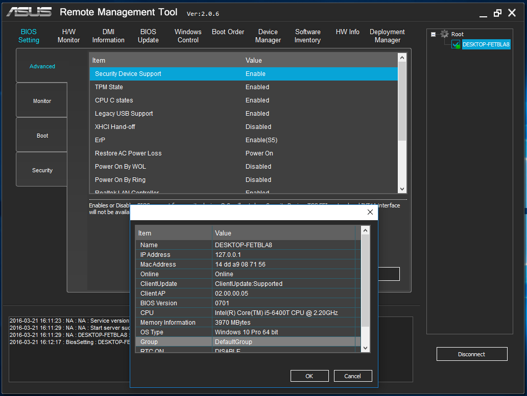 Для удаленного контроля и управления может быть полезен набор из сервера и клиента Asus Remote Management Tool. Он, в частности, позволяет осуществлять такие операции как обновление и изменение настроек BIOS, выбор загрузочного устройства, аппаратный мониторинг, просмотр аппаратной и программной конфигурации клиента.
