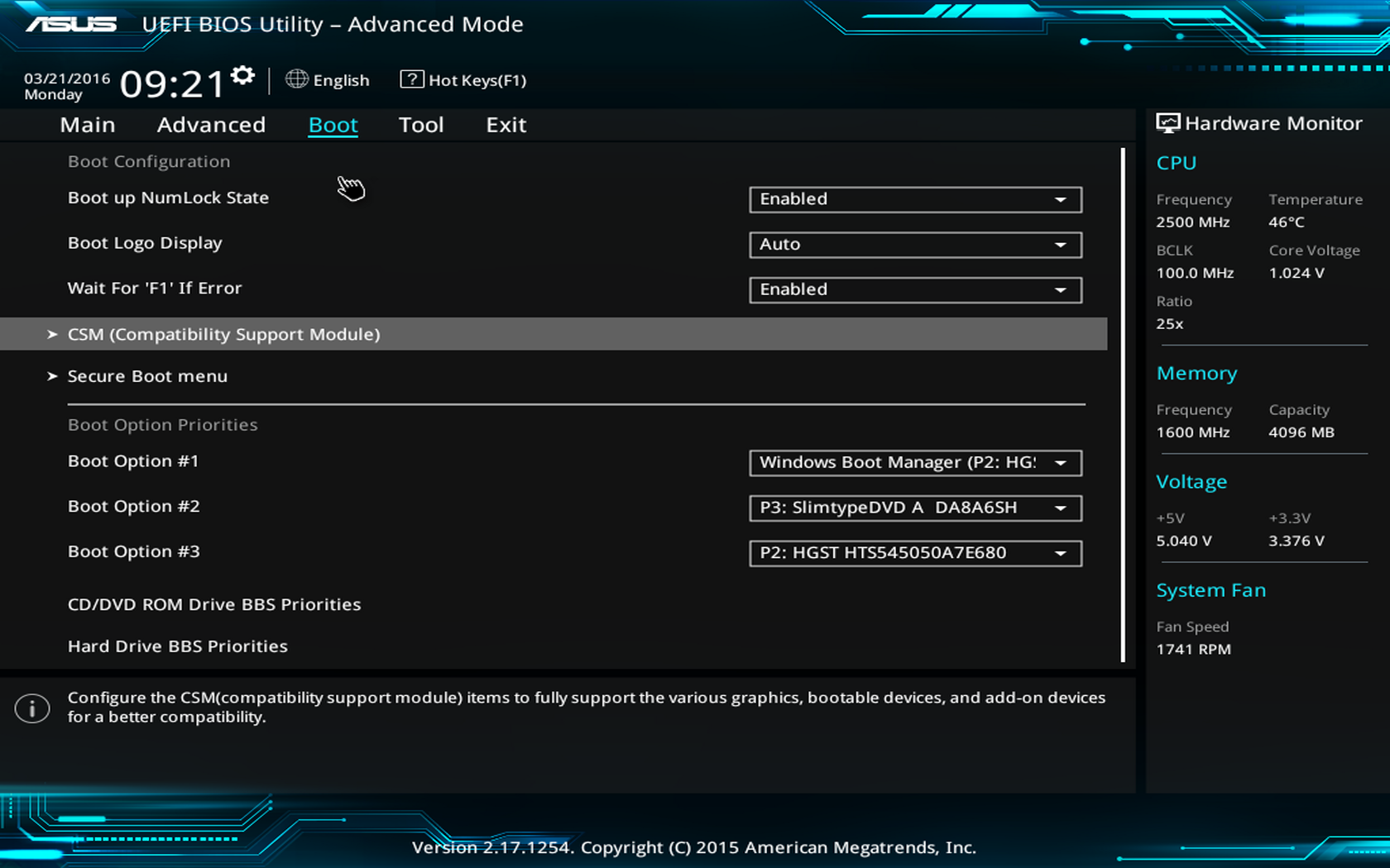 В разделе Boot выбирается нужное загрузочное устройство. Есть поддержка технологии Secure Boot, а также сохраняется возможность использования устаревших вариантов загрузки (есть модуль CSM (Compatibility Support Module). Предусмотрено и BootMenu во время загрузки, оно вызывается нажатием клавиши F8.