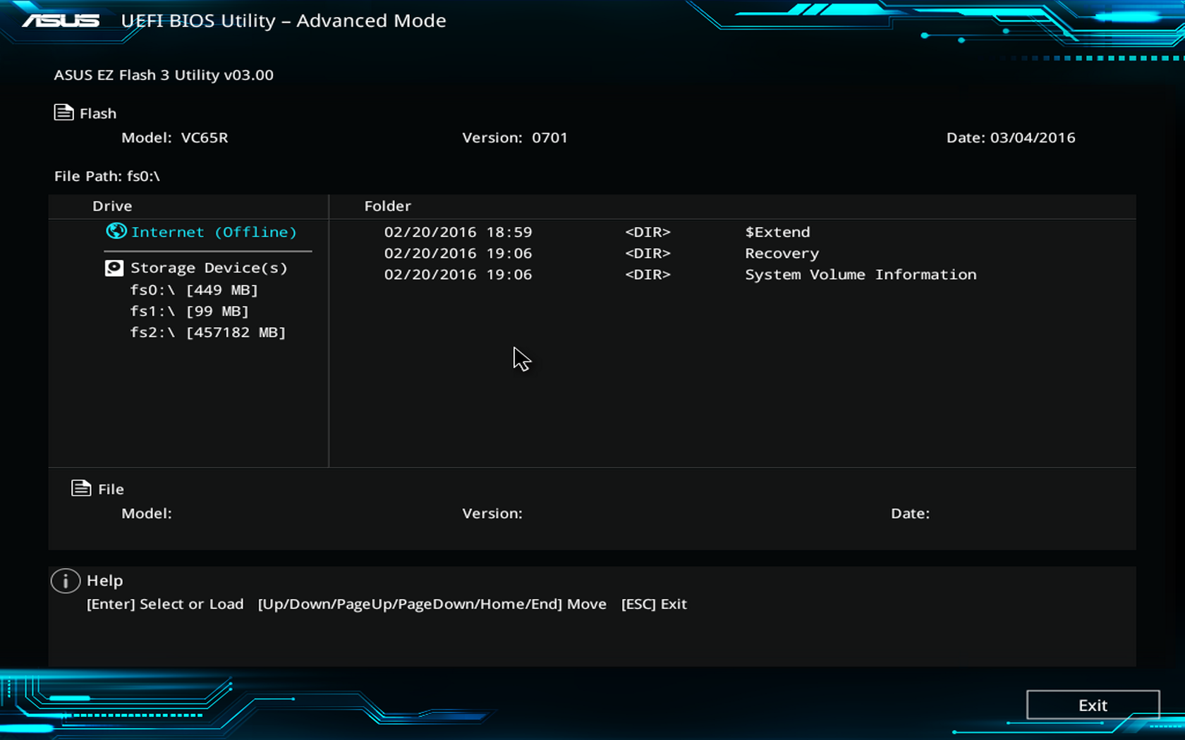 Устройство поддерживает обновление BIOS через встроенную в него фирменную утилиту Asus EZ Flash 3. Она может считать нужный файл с флэш-накопителе, а также загрузить через интернет в случае его доступности. Правда, в нашем случае эта операция оканчивалась неудачей, хотя наличие обновления программа видела. Так что мы самостоятельно скачали и установили через флэшку версию 0701.