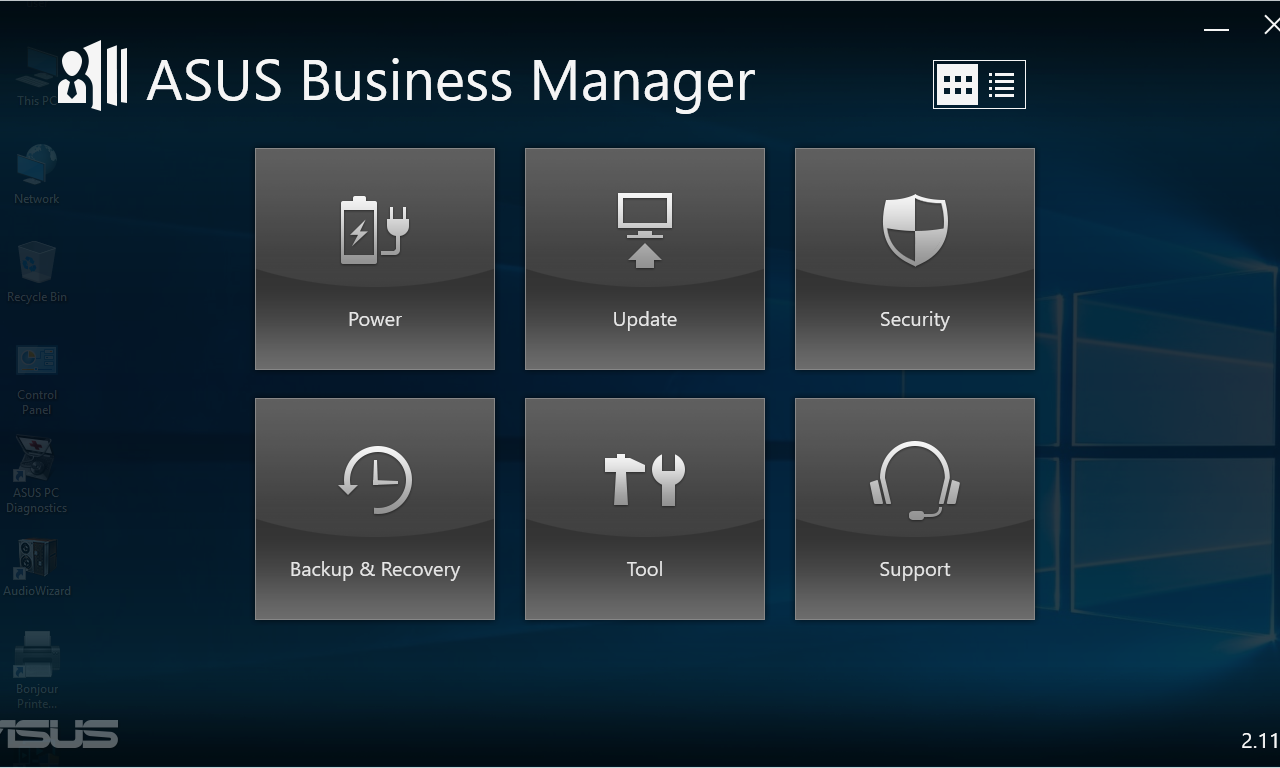 Для использования в рабочей среде предлагается специальный комплект утилит, которые устанавливаются через программу Asus Business Manager. В частности здесь представлены Asus Update для проверки и установки обновлений BIOS, драйверов и программ, Asus Power Manager для настройки режимов работы процессора и энергосбережения, Asus PC Cleanup для очистки жесткого диска от ненужных файлов и надежного удаления документов, Asus USB Lock для ограничения доступа к сменным носителям, Asus Backup & Recovery является надстройкой над штатными сервисами операционной системы по работе с точками восстановления, а также позволяет создать аварийный загрузочный диск.