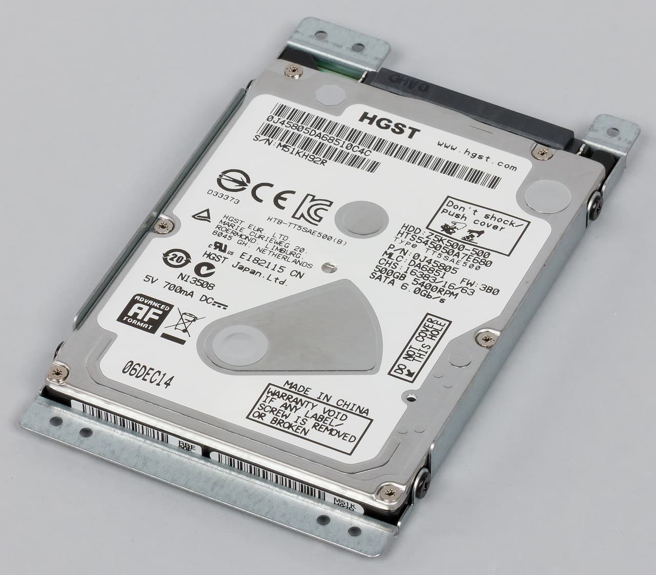 Тестируемый экземпляр компьютера использовал жесткий диск HGST Travelstar Z5K500 объемом 500 ГБ (модель HTS545050A7E680). Этот традиционный винчестер формата 2,5″ имеет толщину 7 мм, скорость вращения 5400 об/мин, Advanced Format с размером сектора 4 КБ и интерфейс SATA 6 Гбит/с.