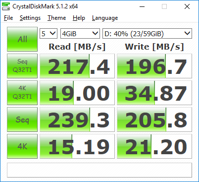 Максимальные значения для последовательных операций похожи на другие модели — чтение на 150 МБ/с и запись на 40 МБ/с. А вот со случайной записью явно что-то не так — производительность этих сценариев очень низкая по сравнению с другими накопителями в подобных устройствах.