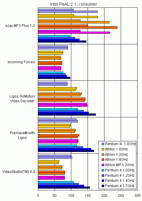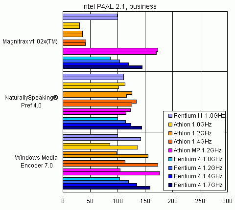 В целом по результатам тестов Intel P4AL можно сказать следующее: Intel Pentium 4 быстрее своего предшественника. Что, в общем-то, неудивительно новая архитектура и более высокие частоты решают все. А для некоторых приложений также играет роль эффективная реализация SSE2.