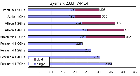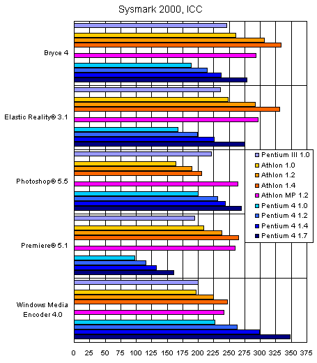 Что касается процессоров AMD Athlon, то они показывают сегодня высокую производительность на старых, не оптимизированных специально под них приложениях теста Sysmark 2000. И если судить только по этим тестам, что конечно же не слишком правильно, то система на Athlon 1.4GHz практически везде сегодня самая быстрая, и даже частота ядра 1.7GHz и высокопроизводительная память не сильно помогают Pentium 4.