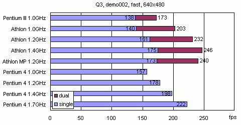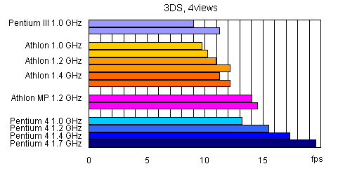 Абсолютно противоположная ситуация :). Скорость прорисовки сцены на Pentium 4 просто великолепна. На частоте 1.4GHz он на 40% опережает соответствующий Athlon. И только Athlon MP еще как-то соперничает с Pentium 4 1.2GHz.