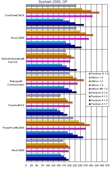 Все современные платформы обеспечивают высокую производительность в большинстве офисных приложений, и подобрать конфигурацию для этих задач несложно. Последний процессор компании Intel Pentium 4 показал невысокие результаты на большинстве старых приложений теста Sysmark 2000. В безоговорочных лидерах здесь процессоры Athlon компании AMD.