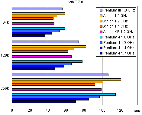 Для кодирования 29MB MPEG1 видеофайла в формат WMA использовался Windows Media Encoder 7.0. Выходной файл создавался для битовых скоростей 64, 128 и 256Kbit/s (профили 35 в свежеустановленном WME). Приведены данные только однопроцессорных систем. Измеряется время преобразования, поэтому лучшая скорость соответствует меньшей цифре: