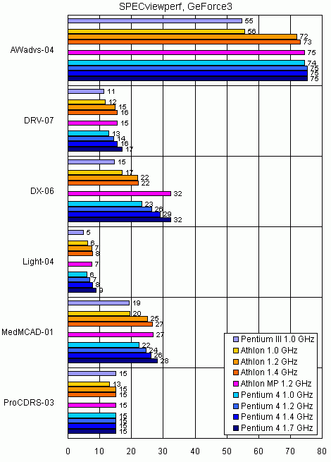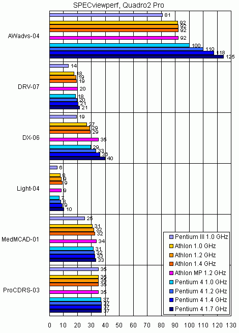 Итак, подведем итоги этого теста. В комбинации с профессиональным видеоускорителем система на базе Intel Pentium 4 и RDRAM занимает первое место. Следом идет AMD Athlon MP, затем остальные процессоры Athlon, и на последнем месте Intel Pentium III. Однако явное лидерство Pentium 4 наблюдается только в AWadvs-04 и DX-06. В MedMCAD-01 впереди Athlon MP, а остальные тесты показывают слишком похожие результаты, чтобы делать выводы из разницы в десятые доли fps.