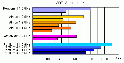 Последние два теста проводятся в программе 3DStudio MAX 3.0. Напомним, что эта программа использует SMP при рендеринге кадров и при стандартной установке не оптимизирована под какой-либо процессор. Для процессоров Pentium III и Athlon приведены результаты и для SMP конфигураций. По горизонтальной оси отложено время в секундах (т.е. чем меньше, тем лучше):