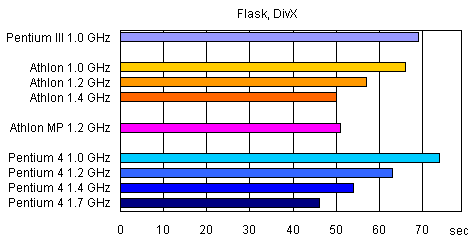 Кодирование в DivX проводилось с использованием программы Flask 0.594 и DivX кодека версии 3.11alpha. Исходный VOB файл размером 27MB DolbyDigitalBroadway.vob. Измерялось время преобразования (снова чем меньше цифра, тем лучше):