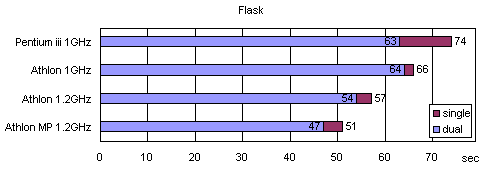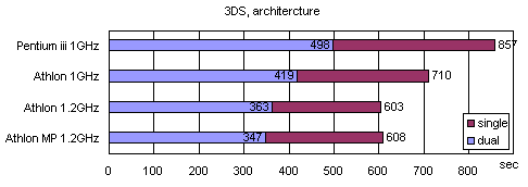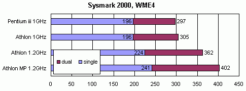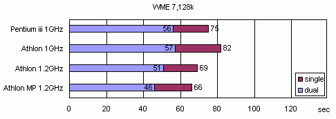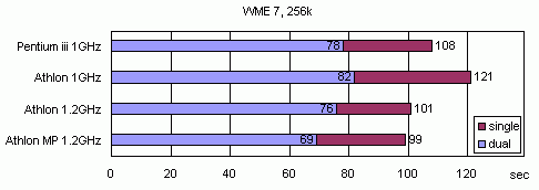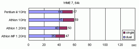Здесь мы снова видим небольшое отставание системы на Pentium III, а также заметный (40%) отрыв Athlon MP от простого Athlon в однопроцессорной конфигурации. Зато SMP конфигурация на процессоре Intel немного опережает аналогичную на Athlon 1GHz. Обратите внимание, что в тестах WME 7 та же ситуация.