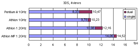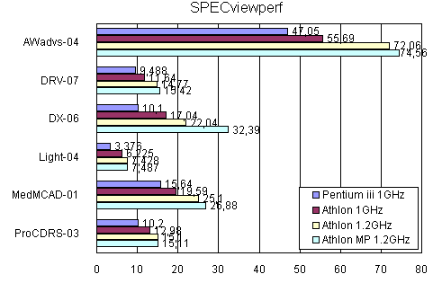 Во-вторых, использовался тестовый пакет SPECviewperf; его результаты приводятся только для однопроцессорных конфигураций, поскольку он не использует SMP. Правда, оказалось, что для него уже при процессоре частотой в 1.2GHz ограничением является видеокарта, поэтому его результаты не очень информативны.