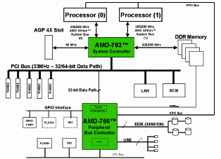 Для нового процессора компания AMD сделала и новый чипсет AMD-760MP. Это первый чипсет для SMP платформ на базе процессоров AMD. Его краткие характеристики: