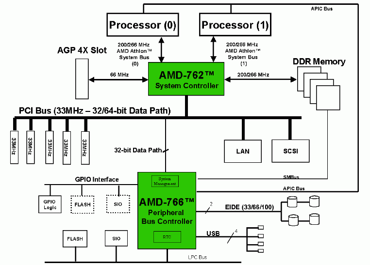 Чипсет использует классическую архитектуру с северным и южным мостом. Связь между ними осуществляется по шине PCI с максимальной пропускной способностью 133 MBps. Несмотря на поддержку чипом AMD-762 шины PCI с частотой 66MHz, в настоящий момент нет южных мостов, работающих на такой скорости, поэтому такие конфигурации пока невозможны. Отличий от известного чипсета AMD-760 всего два поддержка двухпроцессорных конфигураций и 64-битной шины PCI, ну а южный мост вообще используется тот же (AMD-766).