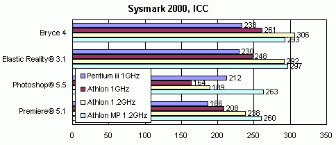 В сравнении участвовали процессоры Intel Pentium III, AMD Athlon и AMD Athlon MP. На приложениях, не оптимизированных специально под наборы инструкций MMX, SSE, 3DNow! (правда, похоже, что последних в тестах не было), процессор AMD Athlon показал более высокие результаты, чем Intel Pentium III. На некоторых приложениях заметен и отрыв процессора Athlon MP от простого Athlon. Видимо, неафишируемо произведено некоторое совершенствование архитектуры, хотя если почитать описания этих процессоров на сайте AMD, то с первого взгляда очень сложно найти в них отличия (кроме, конечно, поддержки SSE). В целом эти результаты согласуются с уже неоднократно проводившимися на нашем сайте сравнениями.