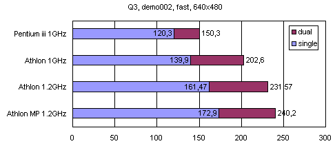 Теперь тесты в Quake3 Arena. Эта игра все еще достаточно часто используется для сравнения скорости различных систем. Я провел все тесты, как и в предшествующих статьях, используя три демо с различными установками качества в четырех разрешениях, но поскольку сегодня мы рассматриваем скорость процессоров, результаты будут приведены для наименьшего разрешения 640x480. Из демо demo002, q3crush, quaver для иллюстрации было выбрано demo002, поскольку показывает самые большие fps :), для оставшихся двух демо картинки аналогичны: