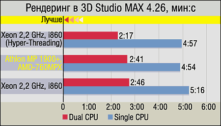 Итак, практически все программы трехмерного моделирования (3D Studio MAX, LightWave, A|W Maya), в принципе, "единодушны" — лидируют системы на базе Intel Xeon. Однако в деталях небольшие различия есть. Так, выигрыш Xeon в 3D Studio MAX можно считать чисто номинальным — только системы с включенным Hyper-Threading обгоняют аналогичные по количеству процессоров платформы AMD, да и то незначительно. Воистину "разгромными" для платформы AMD являются только результаты LightWave 7b, но если вспомнить тот факт, что NewTek чуть ли не "персонально посвятила" выпуск седьмой версии LightWave процессору Intel Pentium 4, то все становится на свои места. Впрочем, A|W Maya также в большей степени "симпатизирует" Xeon, хотя эту программу, насколько нам известно, разработчики ни под какие процессоры особо не оптимизировали.