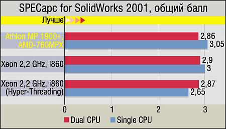 Что же касается CAD-тестов (SolidWorks 2001 и Solid Edge V10), то тут конкурирующие платформы сыграли со счетом 1:1 — одна программа больше "любит" процессоры AMD (SolidWorks), вторая — CPU от Intel (Solid Edge). Однако фактически "победила дружба", потому что даже в случае, когда разница есть, она весьма невелика и вряд ли "взволнует" кого-то из пользователей такого ПО или послужит решающим аргументом в пользу приобретения одной или другой системы. Для экономии места мы даем только диаграмму с результатами SolidWorks (можно воспринимать это как "реверанс" в адрес основного героя теста), а по поводу Solid Edge просто скажем, что выигрыш систем на базе Xeon примерно такой же (мизерный), как и их проигрыш в данном случае.